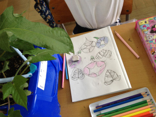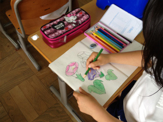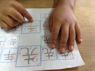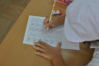 1日5文字、朝の学習または国語の時間に書き取りの基礎練習をします。写真のようなワークシートを使って、指なぞり(書き順を言いながら指で書くこと)、なぞり書き(お手本を丁寧になぞって書くこと)、写し書き(お手本を写して書くこと)をします。