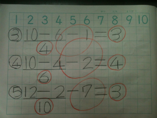 例えば、10ー6-1の計算であれば、[10ひく6ひく1の計算は、10ひく6は4。4ひく1は3。こたえ3です]と声に出して説明します。